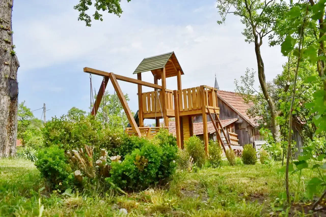 A kis házban, egy légtérben max 5 férőhely van: a galéria egyik felében 1 db kihúzható kanapé 2 személy részére, a galéria másik felében matracok 3 személynek. A földszinten nappali konyhasarokkal, búbos kemencével, valamint egy fürdőszoba kapott helyet.