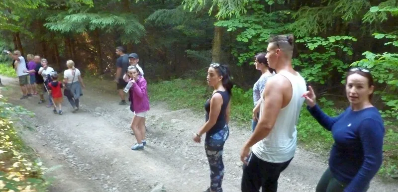 Mielőtt "medvefigyelésre" jöttünk volna, utasítást kaptunk: beszélgetni csak akkor ha muszáj és azt is halkan, suttogva szabad, aztán meg ne használjunk parfümöt, vagy dezodort, mert a medvéknek nagyon kifinomult szaglása van és ka megszimatol, akkor a les az meglesz de medve nélkül.Ahogy közeledünk a megfigyelőállomás fele, újabb táblákat látunk „Figyelem! Veszélyes medvék”! Ezúttal egy barna medve agresszív fotóit láttuk a táblákon. Mint hamarosan kiderült, ezek nem a Google képei voltak, hanem azon a tisztáson készültek, ahol két-három órával napnyugta előtt, minden este, két, három, néha öt, vagy hat medve jön falatozni.